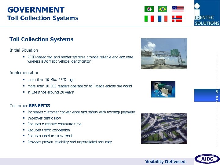 GOVERNMENT Toll Collection Systems 6 Toll Collection Systems AIDC Strategic RFID Workshop 2009 / © IDENTEC SOLUTIONS AG Initial Situation § RFID-based tag and reader systems provide reliable and accurate wireless automatic vehicle identification Implementation § more than 10 Mio. RFID tags § more than 10. 000 readers operate on toll roads across the world § in use since around 20 years Customer BENEFITS § Increases customer convenience and safety with nonstop payment § Improves traffic flow § Reduces customer commute time § Reduces traffic congestion § Reduces need for new roads § Provides proven reliability and unparalleled accuracy Visibility Delivered.