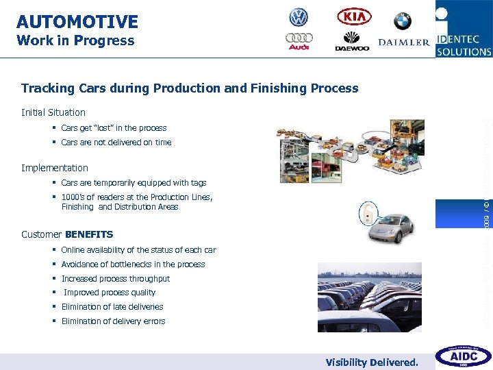 AUTOMOTIVE Work in Progress 8 Tracking Cars during Production and Finishing Process AIDC Strategic RFID Workshop 2009 / © IDENTEC SOLUTIONS AG Initial Situation § Cars get “lost” in the process § Cars are not delivered on time Implementation § Cars are temporarily equipped with tags § 1000’s of readers at the Production Lines, Finishing and Distribution Areas Customer BENEFITS § Online availability of the status of each car § Avoidance of bottlenecks in the process § Increased process throughput § Improved process quality § Elimination of late deliveries § Elimination of delivery errors Visibility Delivered.