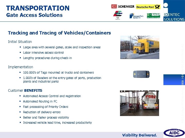 TRANSPORTATION Gate Access Solutions 9 Tracking and Tracing of Vehicles/Containers AIDC Strategic RFID Workshop 2009 / © IDENTEC SOLUTIONS AG Initial Situation § Large area with several gates, scale and inspection areas § Labor intensive access control § Lengthy procedures during check-in Implementation § 100. 000’s of Tags mounted at trucks and containers § 1. 000’s of Readers at the entry gates of ports, production plants and industrial parks Customer BENEFITS § Automated Access Control and registration § Automated Routing in FC § Fast processing of Priority Orders § Reduction of delivery errors § Better and faster process visibility § Increased vehicle lead time, increased productivity Visibility Delivered.