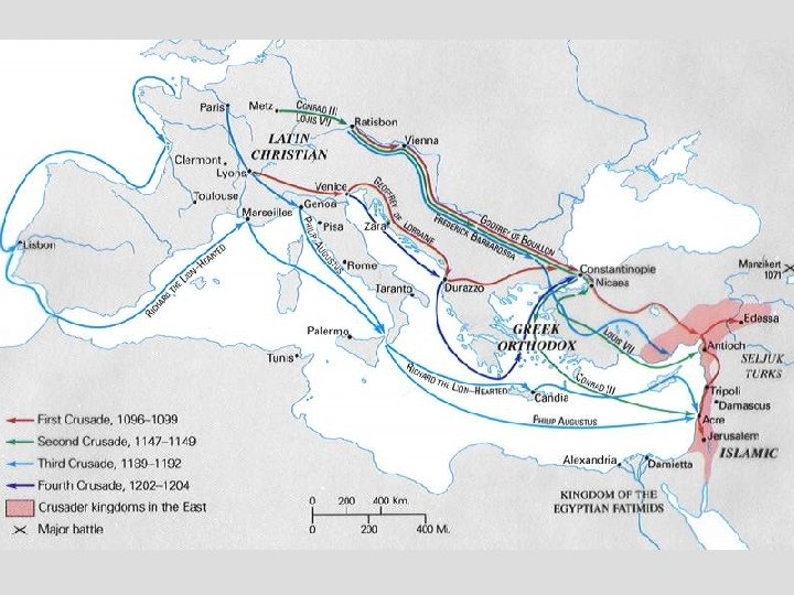 Crusades • The idea of the crusade corresponds to a political conception which was realized in Christendom only from the eleventh to the fifteenth century; this supposes a union of all peoples and sovereigns under the direction of the popes. All crusades were announced by preaching. After pronouncing a solemn vow, each warrior received a cross from the hands of the pope or his legates, and was thenceforth considered a soldier of the Church. Crusaders were also granted indulgences and temporal privileges, such as exemption from civil jurisdiction, inviolability of persons or lands, etc. Of all these wars undertaken in the name of Christendom, the most important were the Eastern Crusades, which are the only ones treated in this article. • DIVISION • It has been customary to describe the Crusades as eight in number: • the first, 1095 -1101; • the second, headed by Louis VII, 1145 -47; • the third, conducted by Philip Augustus and Richard Coeur-de-Lion, 1188 -92; • the fourth, during which Constantinople was taken, 1204; • the fifth, which included the conquest of Damietta, 1217; • the sixth, in which Frederick II took part (1228 -29); also Thibaud de Champagne and Richard of Cornwall (1239); • the seventh, led by St. Louis, 1249 -52; • the eighth, also under St. Louis, 1270.