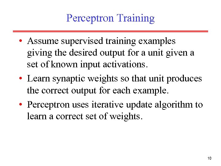 Perceptron Training • Assume supervised training examples giving the desired output for a unit given a set of known input activations. • Learn synaptic weights so that unit produces the correct output for each example. • Perceptron uses iterative update algorithm to learn a correct set of weights. 10