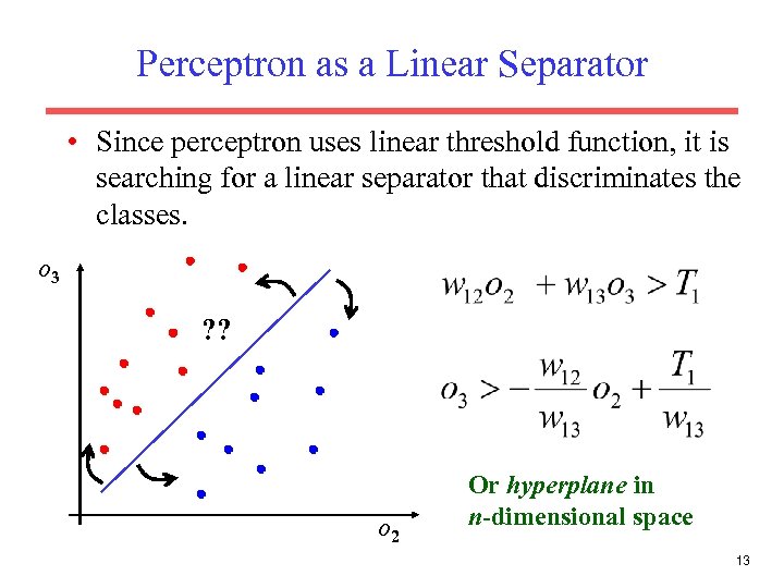 Perceptron as a Linear Separator • Since perceptron uses linear threshold function, it is searching for a linear separator that discriminates the classes. o 3 ? ? o 2 Or hyperplane in n-dimensional space 13