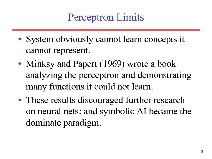 Perceptron Limits • System obviously cannot learn concepts it cannot represent. • Minksy and Papert (1969) wrote a book analyzing the perceptron and demonstrating many functions it could not learn. • These results discouraged further research on neural nets; and symbolic AI became the dominate paradigm. 15