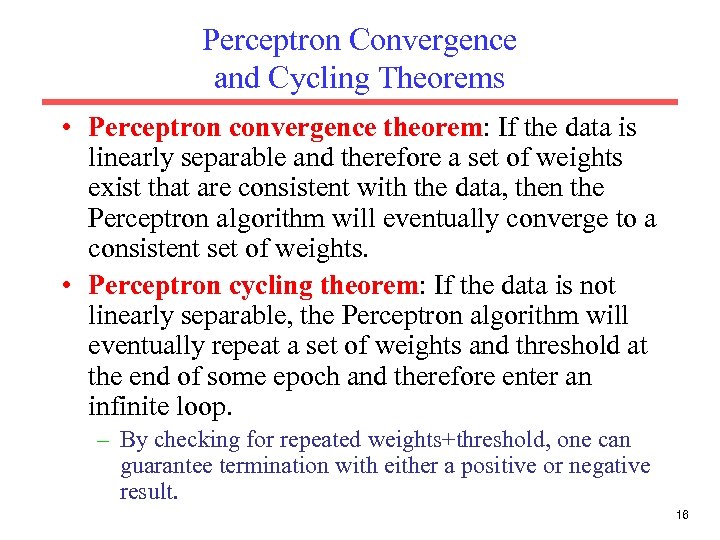 Perceptron Convergence and Cycling Theorems • Perceptron convergence theorem: If the data is linearly separable and therefore a set of weights exist that are consistent with the data, then the Perceptron algorithm will eventually converge to a consistent set of weights. • Perceptron cycling theorem: If the data is not linearly separable, the Perceptron algorithm will eventually repeat a set of weights and threshold at the end of some epoch and therefore enter an infinite loop. – By checking for repeated weights+threshold, one can guarantee termination with either a positive or negative result. 16