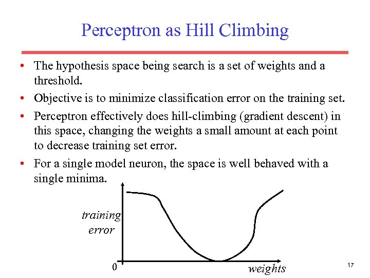 Perceptron as Hill Climbing • The hypothesis space being search is a set of weights and a threshold. • Objective is to minimize classification error on the training set. • Perceptron effectively does hill-climbing (gradient descent) in this space, changing the weights a small amount at each point to decrease training set error. • For a single model neuron, the space is well behaved with a single minima. training error 0 weights 17