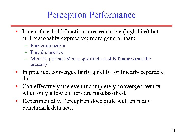Perceptron Performance • Linear threshold functions are restrictive (high bias) but still reasonably expressive; more general than: – Pure conjunctive – Pure disjunctive – M-of-N (at least M of a specified set of N features must be present) • In practice, converges fairly quickly for linearly separable data. • Can effectively use even incompletely converged results when only a few outliers are misclassified. • Experimentally, Perceptron does quite well on many benchmark data sets. 18