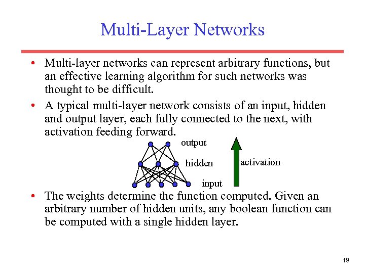 Multi-Layer Networks • Multi-layer networks can represent arbitrary functions, but an effective learning algorithm for such networks was thought to be difficult. • A typical multi-layer network consists of an input, hidden and output layer, each fully connected to the next, with activation feeding forward. output hidden activation input • The weights determine the function computed. Given an arbitrary number of hidden units, any boolean function can be computed with a single hidden layer. 19