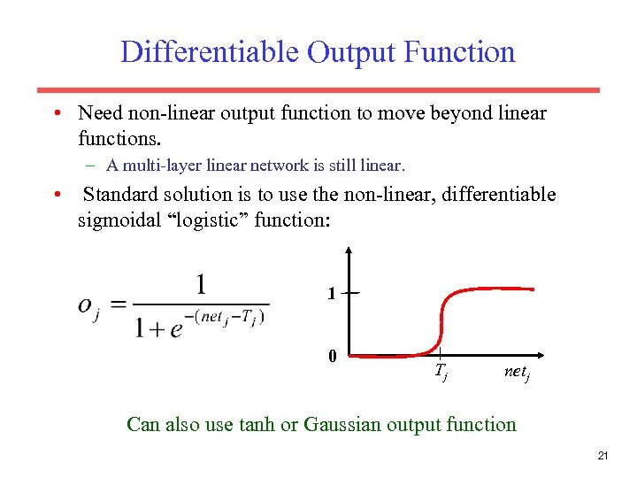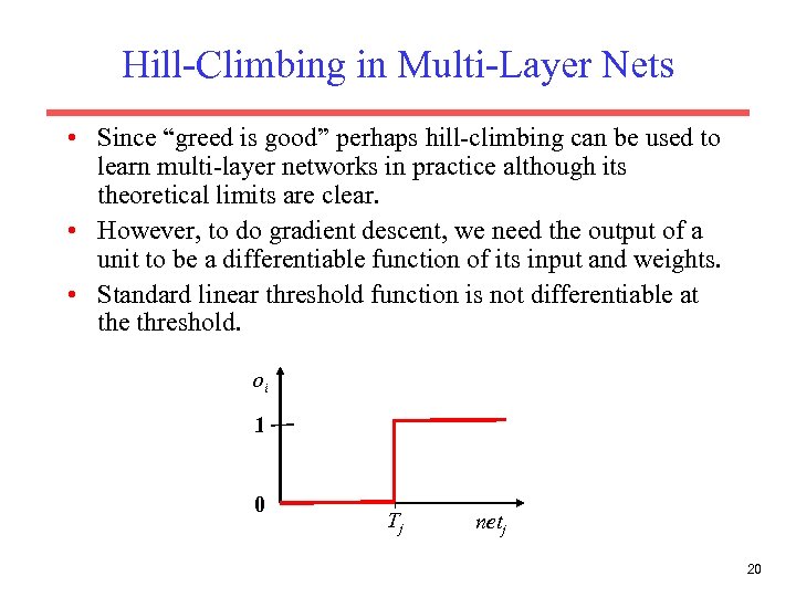 Hill-Climbing in Multi-Layer Nets • Since “greed is good” perhaps hill-climbing can be used to learn multi-layer networks in practice although its theoretical limits are clear. • However, to do gradient descent, we need the output of a unit to be a differentiable function of its input and weights. • Standard linear threshold function is not differentiable at the threshold. oi 1 0 Tj netj 20