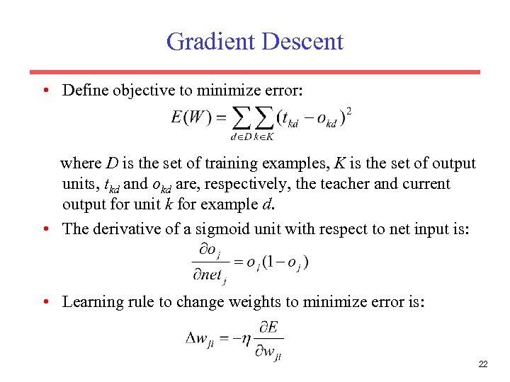 Gradient Descent • Define objective to minimize error: where D is the set of training examples, K is the set of output units, tkd and okd are, respectively, the teacher and current output for unit k for example d. • The derivative of a sigmoid unit with respect to net input is: • Learning rule to change weights to minimize error is: 22