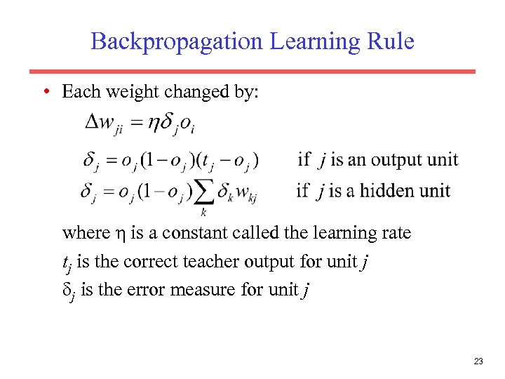 Backpropagation Learning Rule • Each weight changed by: where η is a constant called the learning rate tj is the correct teacher output for unit j δj is the error measure for unit j 23