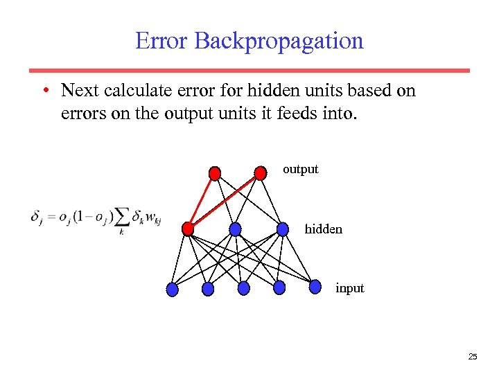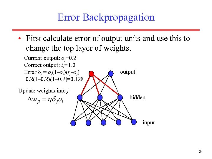 Error Backpropagation • First calculate error of output units and use this to change the top layer of weights. Current output: oj=0. 2 Correct output: tj=1. 0 Error δj = oj(1–oj)(tj–oj) 0. 2(1– 0. 2)=0. 128 output Update weights into j hidden input 24