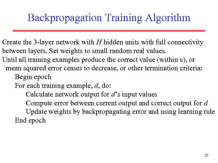 Error Backpropagation • Finally update bottom layer of weights based on errors calculated for hidden units. output Update weights into j hidden input 26