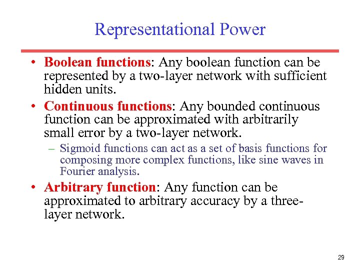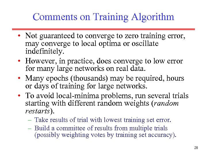 Comments on Training Algorithm • Not guaranteed to converge to zero training error, may converge to local optima or oscillate indefinitely. • However, in practice, does converge to low error for many large networks on real data. • Many epochs (thousands) may be required, hours or days of training for large networks. • To avoid local-minima problems, run several trials starting with different random weights (random restarts). – Take results of trial with lowest training set error. – Build a committee of results from multiple trials (possibly weighting votes by training set accuracy). 28