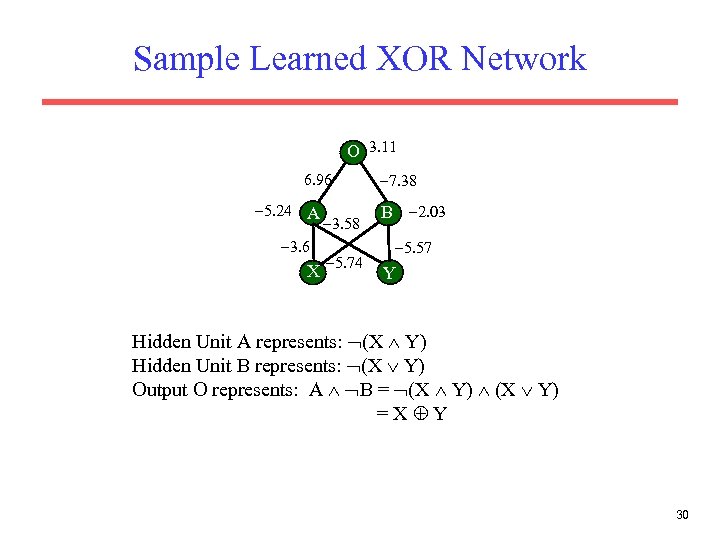Sample Learned XOR Network O 3. 11 6. 96 5. 24 A 3. 6 X 3. 58 5. 74 7. 38 B 2. 03 5. 57 Y Hidden Unit A represents: (X Y) Hidden Unit B represents: (X Y) Output O represents: A B = (X Y) =X Y 30