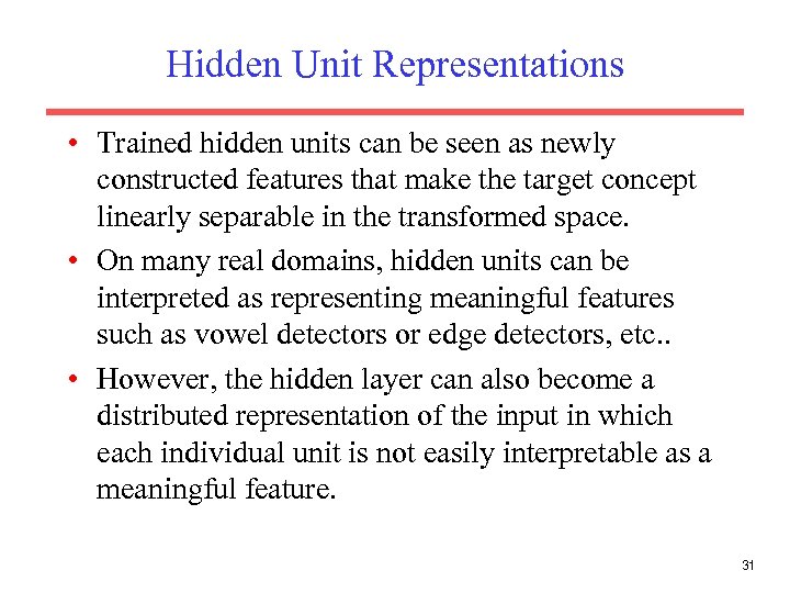 Hidden Unit Representations • Trained hidden units can be seen as newly constructed features that make the target concept linearly separable in the transformed space. • On many real domains, hidden units can be interpreted as representing meaningful features such as vowel detectors or edge detectors, etc. . • However, the hidden layer can also become a distributed representation of the input in which each individual unit is not easily interpretable as a meaningful feature. 31