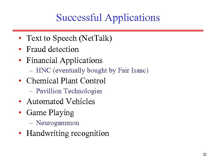 Successful Applications • Text to Speech (Net. Talk) • Fraud detection • Financial Applications – HNC (eventually bought by Fair Isaac) • Chemical Plant Control – Pavillion Technologies • Automated Vehicles • Game Playing – Neurogammon • Handwriting recognition 32