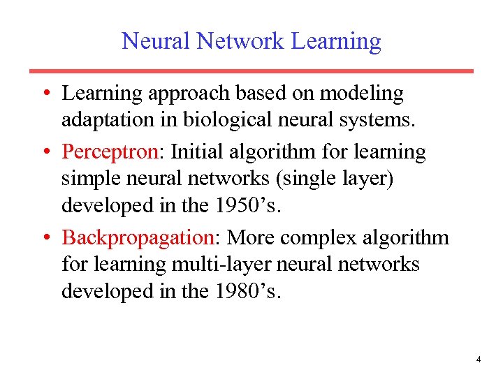 Neural Speed Constraints • Neurons have a “switching time” on the order of a few milliseconds, compared to nanoseconds for current computing hardware. • However, neural systems can perform complex cognitive tasks (vision, speech understanding) in tenths of a second. • Only time for performing 100 serial steps in this time frame, compared to orders of magnitude more for current computers. • Must be exploiting “massive parallelism. ” • Human brain has about 1011 neurons with an average of 104 connections each. 3