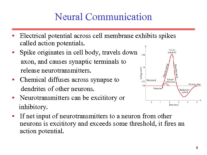 Neural Communication • Electrical potential across cell membrane exhibits spikes called action potentials. • Spike originates in cell body, travels down axon, and causes synaptic terminals to release neurotransmitters. • Chemical diffuses across synapse to dendrites of other neurons. • Neurotransmitters can be excititory or inhibitory. • If net input of neurotransmitters to a neuron from other neurons is excititory and exceeds some threshold, it fires an action potential. 6