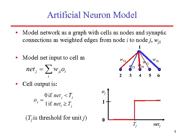 Artificial Neuron Model • Model network as a graph with cells as nodes and synaptic connections as weighted edges from node i to node j, wji 1 • Model net input to cell as w 12 2 w 15 w 13 w 14 3 4 5 w 16 6 • Cell output is: oj 1 (Tj is threshold for unit j) 0 Tj netj 8