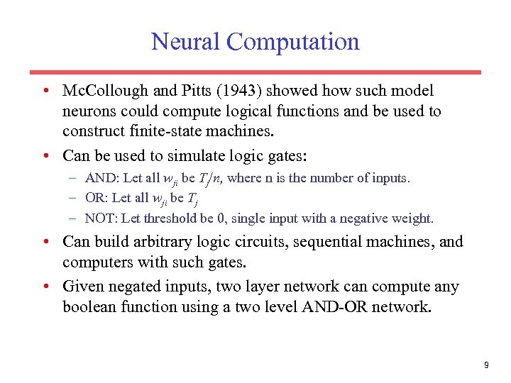 Neural Computation • Mc. Collough and Pitts (1943) showed how such model neurons could compute logical functions and be used to construct finite-state machines. • Can be used to simulate logic gates: – AND: Let all wji be Tj/n, where n is the number of inputs. – OR: Let all wji be Tj – NOT: Let threshold be 0, single input with a negative weight. • Can build arbitrary logic circuits, sequential machines, and computers with such gates. • Given negated inputs, two layer network can compute any boolean function using a two level AND-OR network. 9