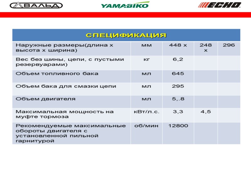 Конструктивные особенности Большой полупрозрачный топливный бак Крышка шины из магниевого сплава Воздушный фильтр и сапун топливного бака Защищенная кнопка выключателя Двойной зубчатый упор Съемный, способный вращаться уловитель цепи G-force система предварительной очистки воздуха Антивибрационная система Уровень вибрации Двухопорное крепление ручки тормоза Шина со сменным наконечником Надежность, надежность и еще раз надежность