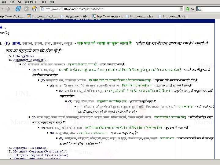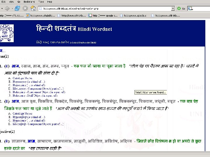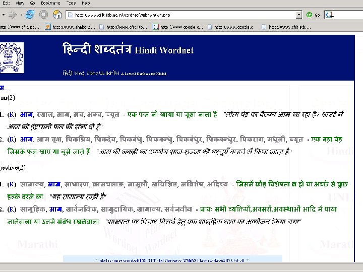 Building MWN from HWN(cont. ) • When sense is present in both, then semantic relations in HWN are borrowed directly in MWN. • Lexical relationships are added manually. • If the sense is only present in Marathi, then all the relationships are to be established manually.
