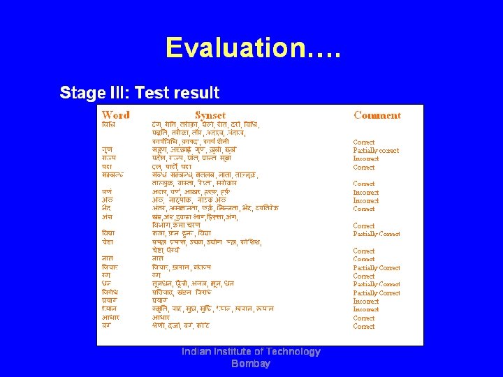 Synset creation (continued) From the wordnet of another language in the same family – Pick the synset and obtain the sense from the gloss. – Get the words of the target language. – Often same words can be used- especially for t%sama words. – Translation, Insertion and deletion. Hindi Synset: Anau. Bava. I jaanakar ma. Mjaa hu. Aa (experienced person) Marathi Synset: Anau. Bava. I t& jaa. Nata &ata