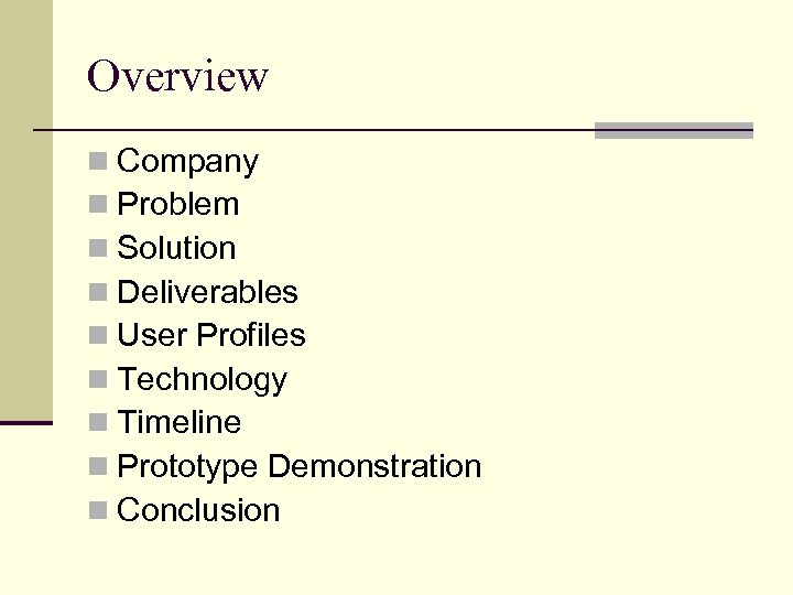 Overview n Company n Problem n Solution n Deliverables n User Profiles n Technology n Timeline n Prototype Demonstration n Conclusion