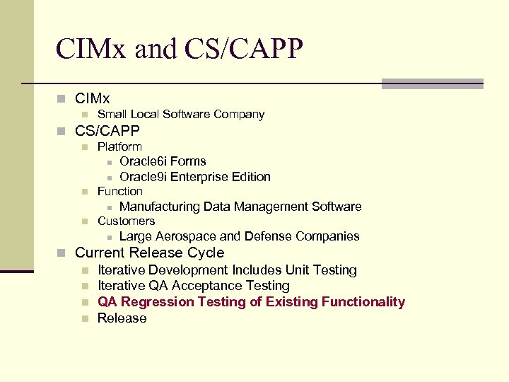 CIMx and CS/CAPP n CIMx n Small Local Software Company n CS/CAPP n Platform n n n Function n n Oracle 6 i Forms Oracle 9 i Enterprise Edition Manufacturing Data Management Software Customers n Large Aerospace and Defense Companies n Current Release Cycle n Iterative Development Includes Unit Testing n Iterative QA Acceptance Testing n QA Regression Testing of Existing Functionality n Release