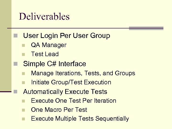 Deliverables n User Login Per User Group n n QA Manager Test Lead n Simple C# Interface n n Manage Iterations, Tests, and Groups Initiate Group/Test Execution n Automatically Execute Tests n Execute One Test Per Iteration n One Macro Per Test n Execute Multiple Tests Sequentially