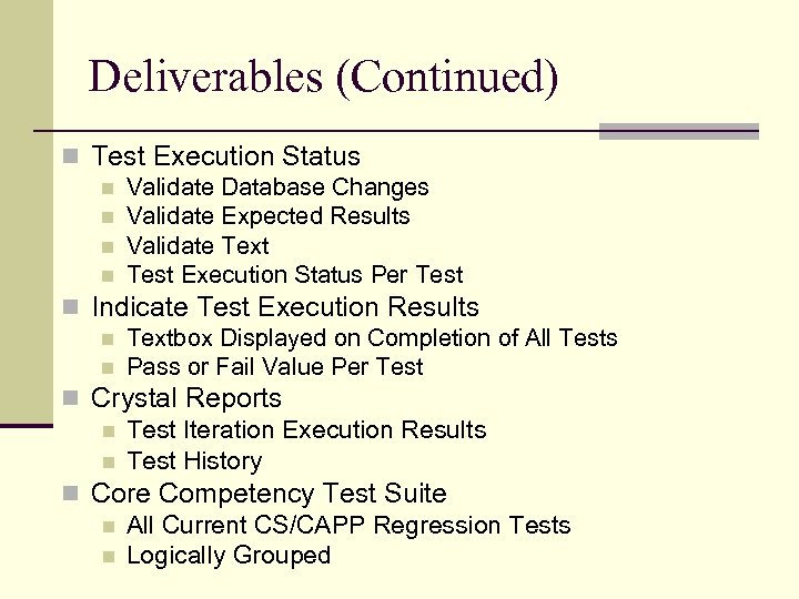 Deliverables (Continued) n Test Execution Status n Validate Database Changes n Validate Expected Results n Validate Text n Test Execution Status Per Test n Indicate Test Execution Results n Textbox Displayed on Completion of All Tests n Pass or Fail Value Per Test n Crystal Reports n Test Iteration Execution Results n Test History n Core Competency Test Suite n All Current CS/CAPP Regression Tests n Logically Grouped