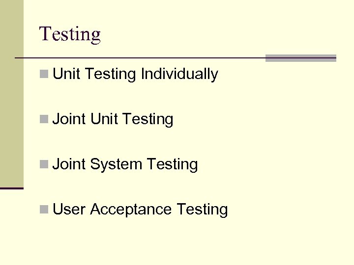 Testing n Unit Testing Individually n Joint Unit Testing n Joint System Testing n User Acceptance Testing