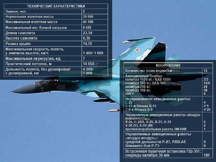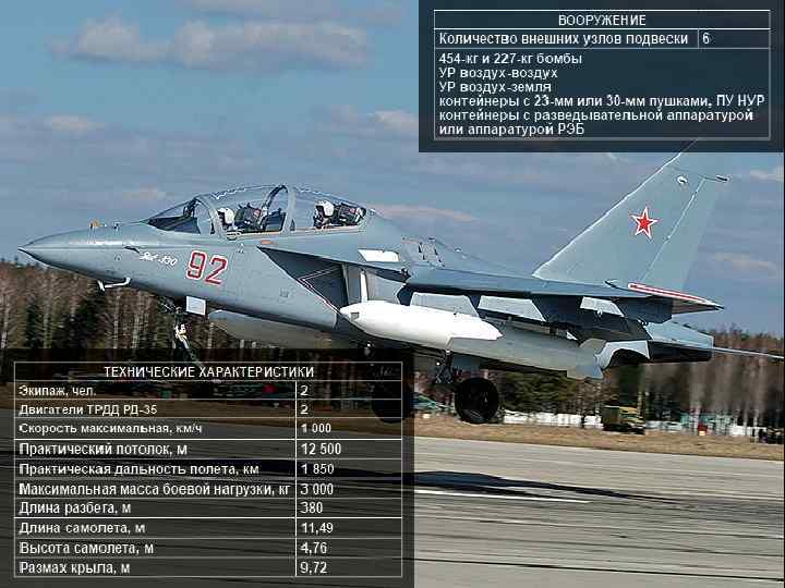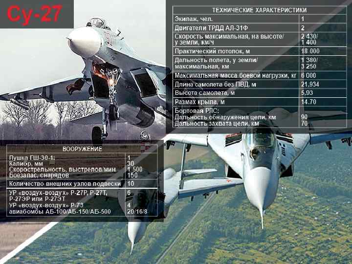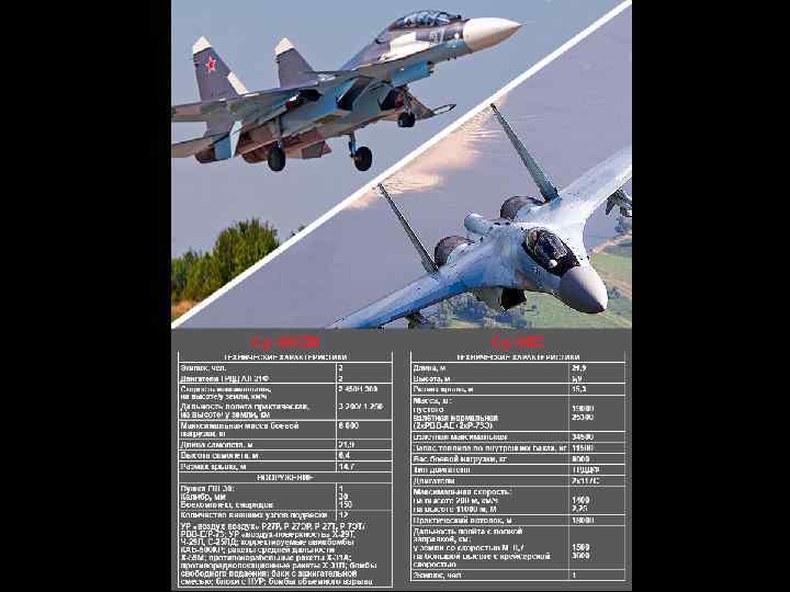 Су-35 • • • Глубокая модернизация советского истребителя четвертого поколения Су-27 - основного АК Российских ВВС. Новый истребитель сразу побил несколько рекордов на международных авиашоу, а именно: Су-35 - единственный в мире истребитель четвертого поколения, способный развивать сверхзвуковую скорость без использования форсажа. Самый маневренный АК в мире. Любой самолет, осмелившийся повторить то, что вытворяет в воздухе Су -35 просто разойдется по швам и развалится… даже легендарный F-22 не может соперничать с этим истребителем по сверхманевренности. Также Су-35 обладает самой продвинутой РЛС среди истребителей четвертого поколения, способной обнаруживать цели на дальности до 400 км.