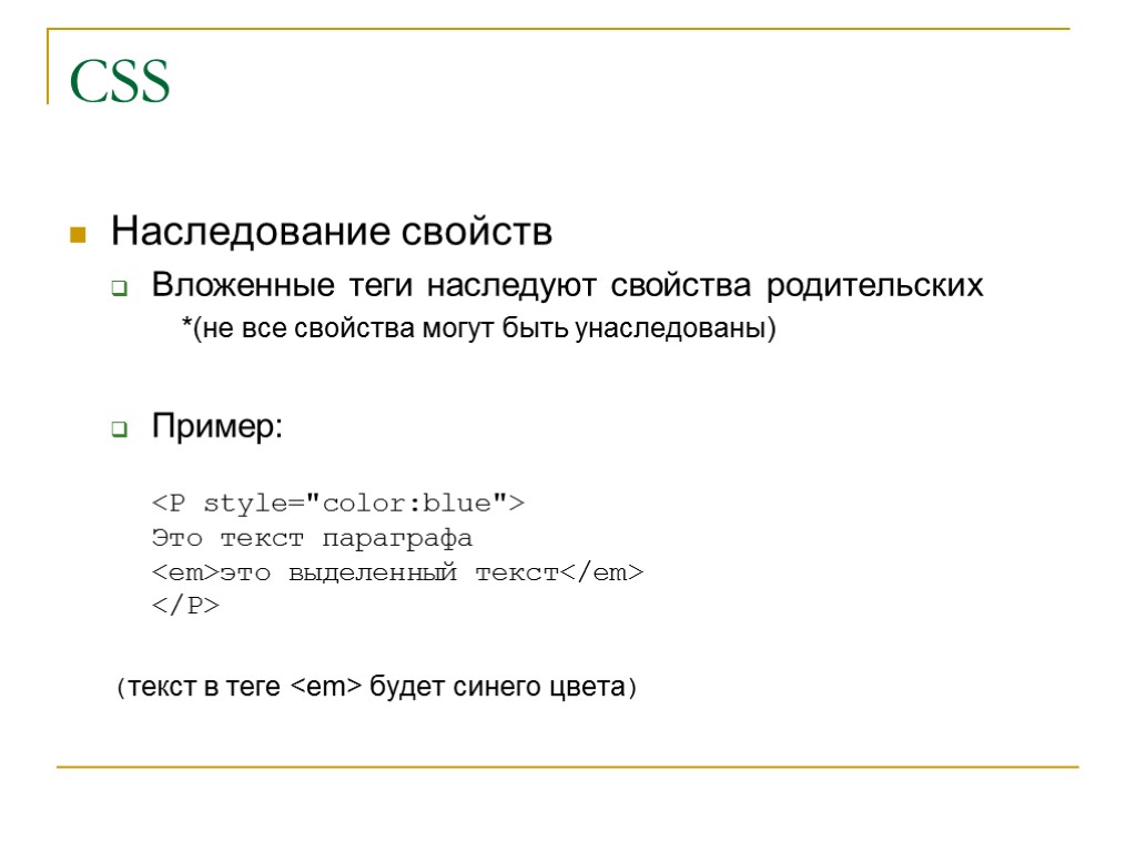 CSS Наследование свойств Вложенные теги наследуют свойства родительских *(не все свойства могут быть унаследованы) Пример: