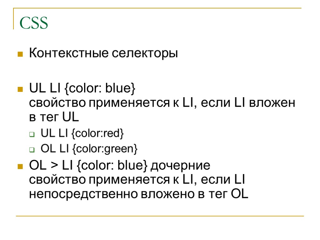 CSS Контекстные селекторы UL LI {color: blue} свойство применяется к LI, если LI вложен в тег UL UL LI {color:red} OL LI {color:green} OL > LI {color: blue} дочерние свойство применяется к LI, если LI непосредственно вложено в тег OL