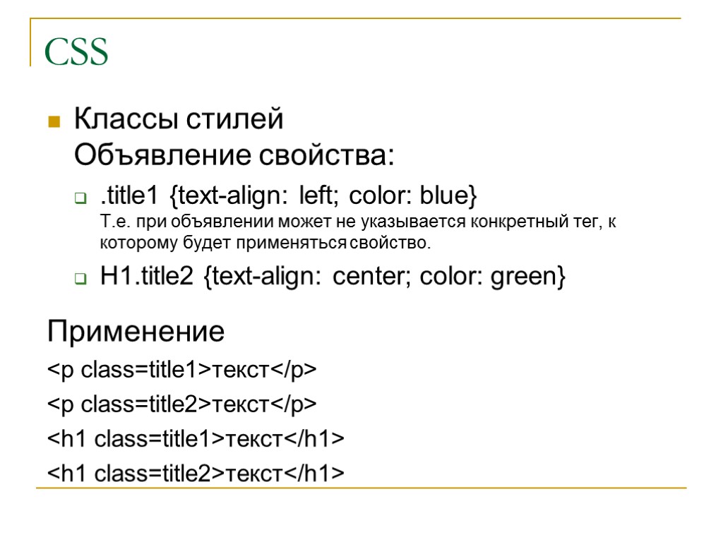 CSS Классы стилей Объявление свойства: .title1 {text-align: left; color: blue} Т.е. при объявлении может не указывается конкретный тег, к которому будет применяться свойство. H1.title2 {text-align: center; color: green} Применение