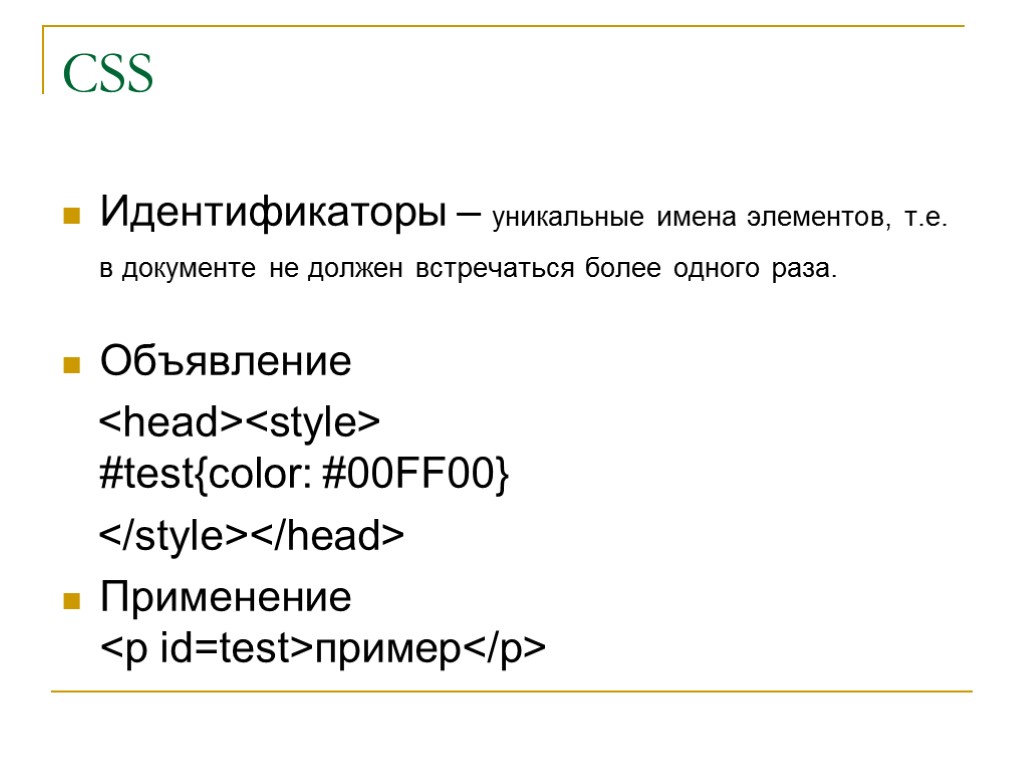 CSS Идентификаторы – уникальные имена элементов, т.е. в документе не должен встречаться более одного раза. Объявление