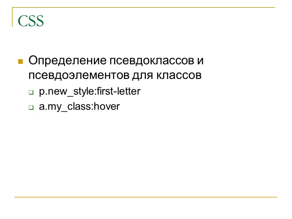 CSS Псевдоклассы – определяют разные типы одного элемента(тега) a:link (обычное) a:visited (посещенное) a:hover (наведенное) a:active (активное, в момент щелчка) *-прописывают состояния в этом порядке, обычно указывая вначале стиль и для самого тега “а”. Псевдоэлементы – выделяют разные части одного элемента (тега) p:first-line p:first-letter