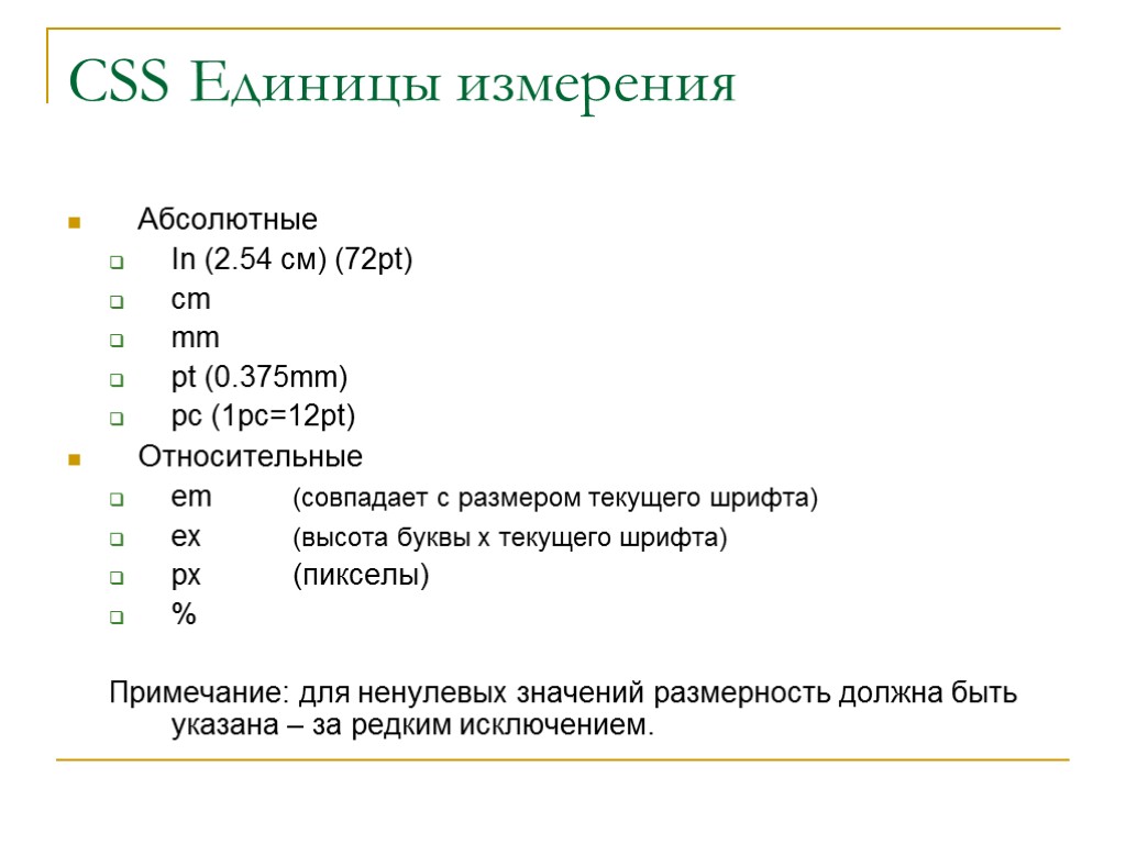 CSS Единицы измерения Абсолютные In (2.54 см) (72pt) cm mm pt (0.375mm) pc (1pc=12pt) Относительные em (совпадает с размером текущего шрифта) ex (высота буквы x текущего шрифта) px (пикселы) % Примечание: для ненулевых значений размерность должна быть указана – за редким исключением.