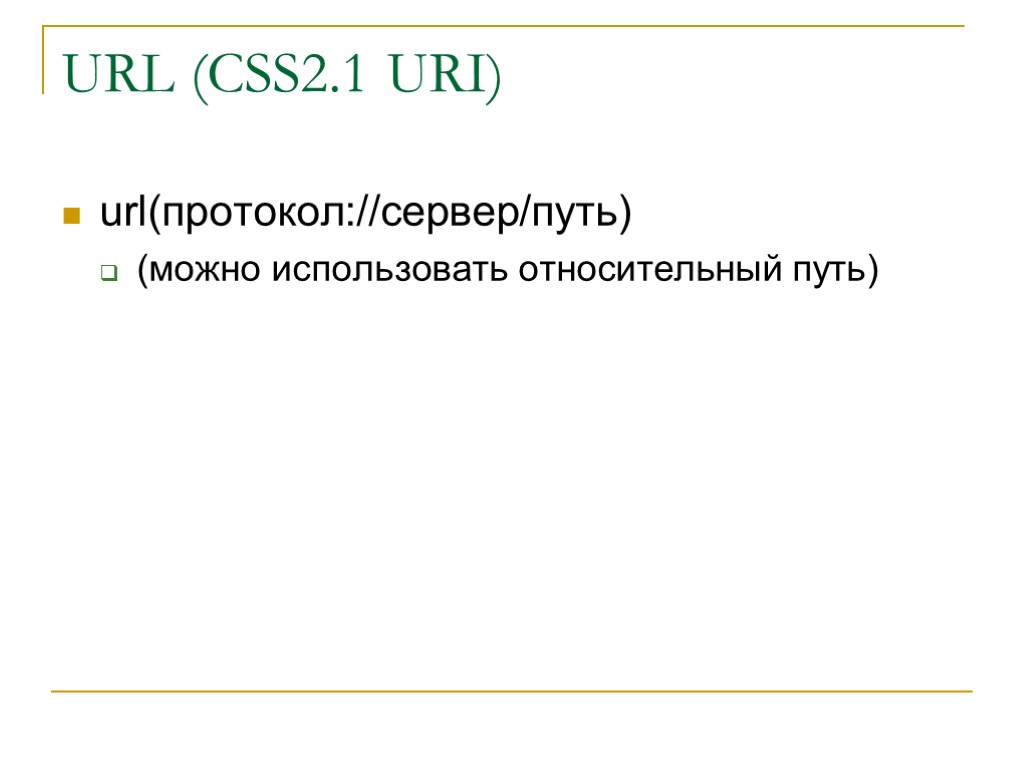 URL (CSS2.1 URI) url(протокол://сервер/путь) (можно использовать относительный путь)