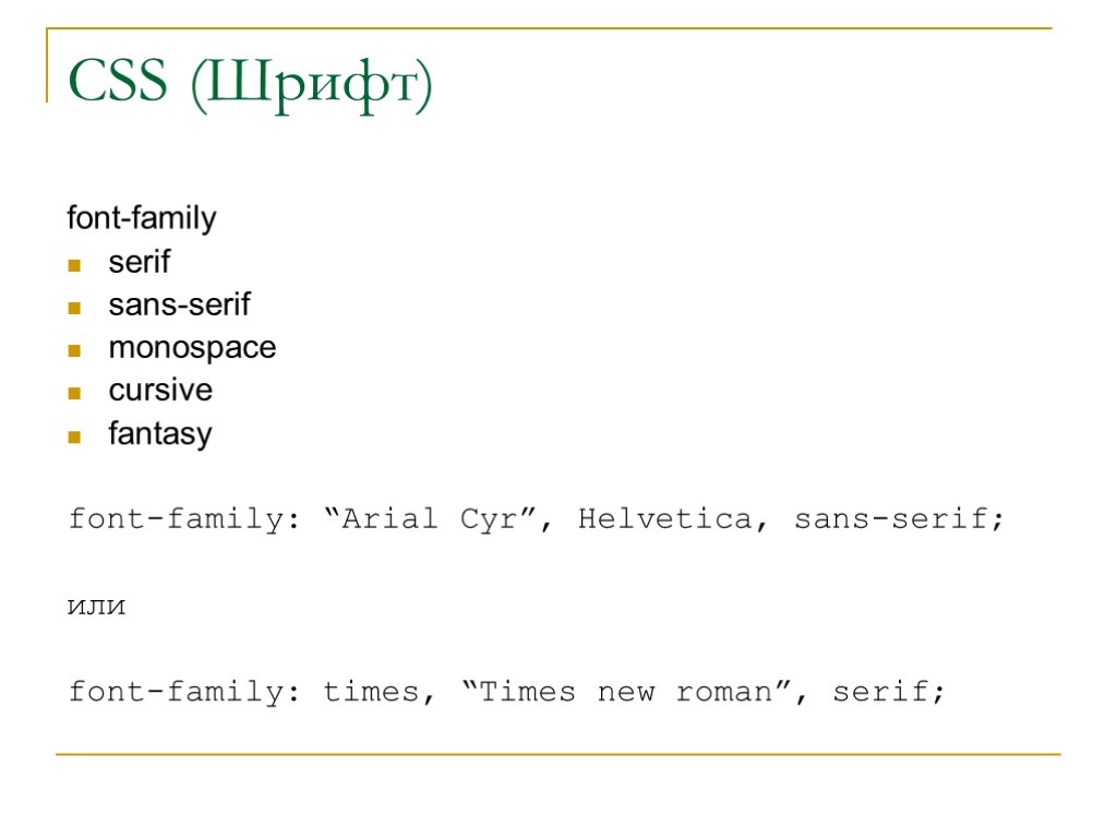 CSS (Шрифт) font-family serif sans-serif monospace cursive fantasy font-family: “Arial Cyr”, Helvetica, sans-serif; или font-family: times, “Times new roman”, serif;