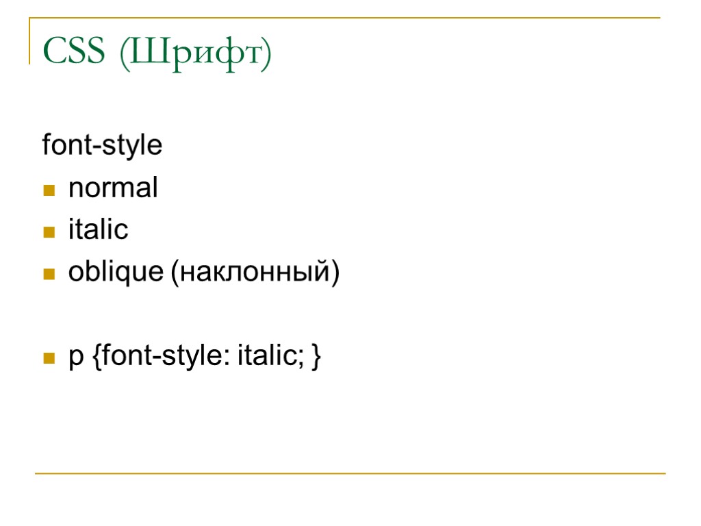 CSS (Шрифт) font-style normal italic oblique (наклонный) p {font-style: italic; }
