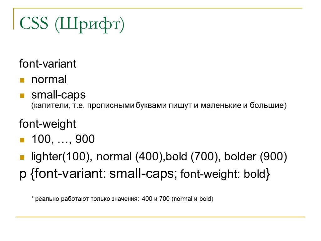 CSS (Шрифт) font-variant normal small-caps (капители, т.е. прописными буквами пишут и маленькие и большие) font-weight 100, …, 900 lighter(100), normal (400),bold (700), bolder (900) p {font-variant: small-caps; font-weight: bold} * реально работают только значения: 400 и 700 (normal и bold)