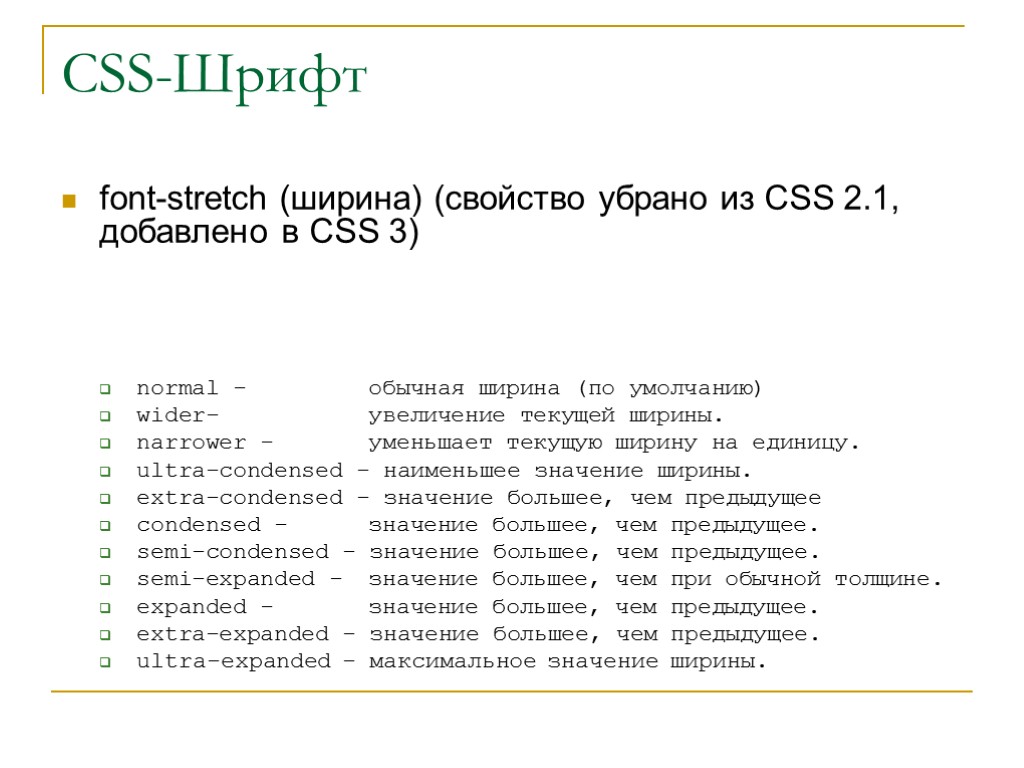 CSS-Шрифт font-stretch (ширина) (свойство убрано из CSS 2.1, добавлено в CSS 3) normal - обычная ширина (по умолчанию) wider- увеличение текущей ширины. narrower - уменьшает текущую ширину на единицу. ultra-condensed - наименьшее значение ширины. extra-condensed - значение большее, чем предыдущее condensed - значение большее, чем предыдущее. semi-condensed - значение большее, чем предыдущее. semi-expanded - значение большее, чем при обычной толщине. expanded - значение большее, чем предыдущее. extra-expanded - значение большее, чем предыдущее. ultra-expanded - максимальное значение ширины.