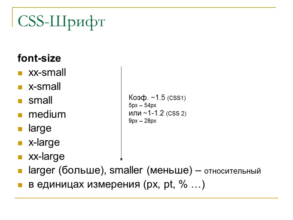 CSS-Шрифт font-size xx-small x-small small medium large x-large xx-large larger (больше), smaller (меньше) – относительный в единицах измерения (px, pt, % …) Коэф. ~1.5 (CSS1) 5px – 54px или ~1-1.2 (CSS 2) 9px – 28px