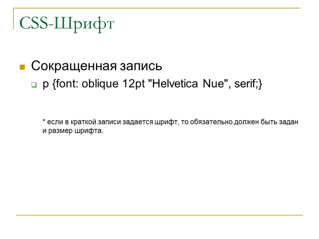 CSS-Шрифт Сокращенная запись p {font: oblique 12pt "Helvetica Nue", serif;} * если в краткой записи задается шрифт, то обязательно должен быть задан и размер шрифта.