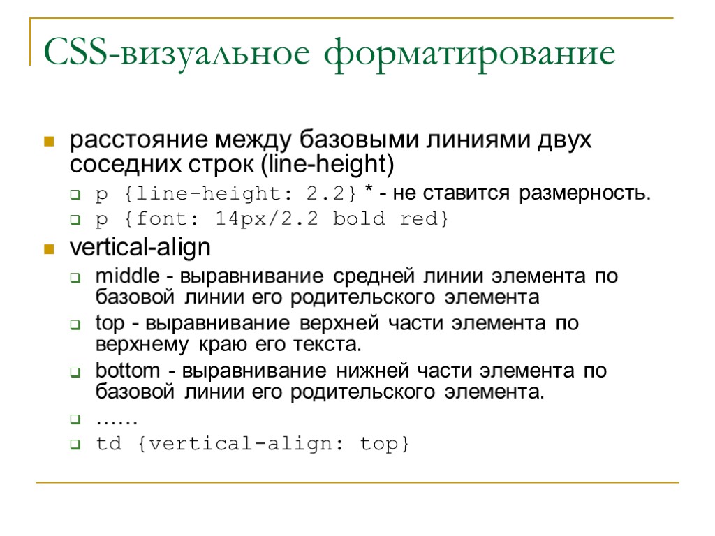 CSS-визуальное форматирование расстояние между базовыми линиями двух соседних строк (line-height) p {line-height: 2.2} * - не ставится размерность. p {font: 14px/2.2 bold red} vertical-align middle - выравнивание средней линии элемента по базовой линии его родительского элемента top - выравнивание верхней части элемента по верхнему краю его текста. bottom - выравнивание нижней части элемента по базовой линии его родительского элемента. …… td {vertical-align: top}