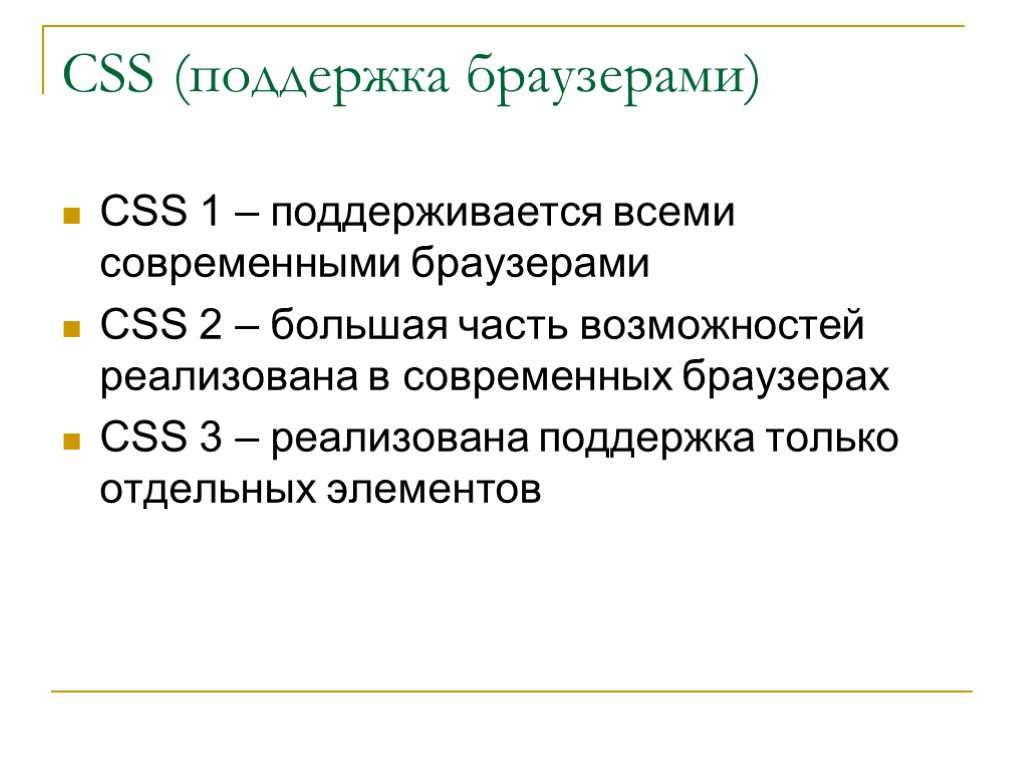 CSS (поддержка браузерами) CSS 1 – поддерживается всеми современными браузерами CSS 2 – большая часть возможностей реализована в современных браузерах CSS 3 – реализована поддержка только отдельных элементов