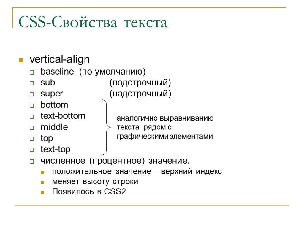 CSS-Свойства текста vertical-align baseline (по умолчанию) sub (подстрочный) super (надстрочный) bottom text-bottom middle top text-top численное (процентное) значение. положительное значение – верхний индекс меняет высоту строки Появилось в CSS2 аналогично выравниванию текста рядом с графическими элементами