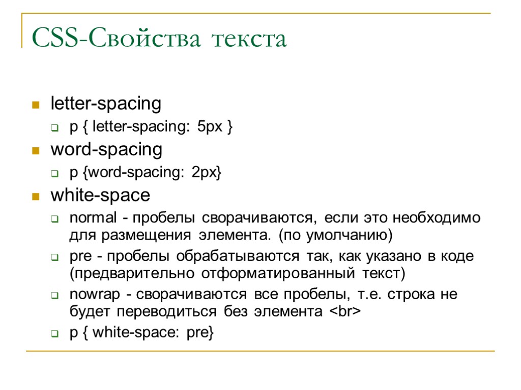 CSS-Свойства текста letter-spacing p { letter-spacing: 5px } word-spacing p {word-spacing: 2px} white-space normal - пробелы сворачиваются, если это необходимо для размещения элемента. (по умолчанию) pre - пробелы обрабатываются так, как указано в коде (предварительно отформатированный текст) nowrap - сворачиваются все пробелы, т.е. строка не будет переводиться без элемента